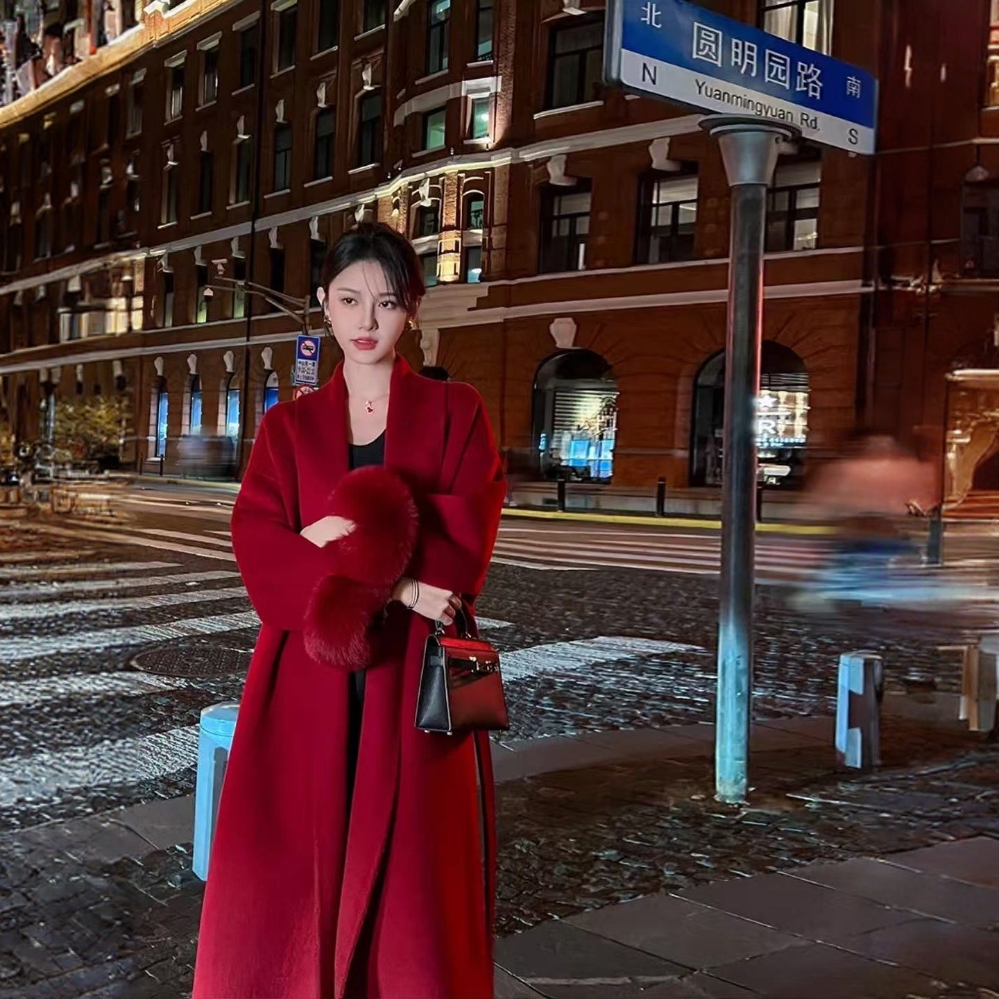 Women's red double-faced cashmere coat, new autumn and winter style, high-end fox fur sleeves, mid-length woolen coat for wedding and engagement