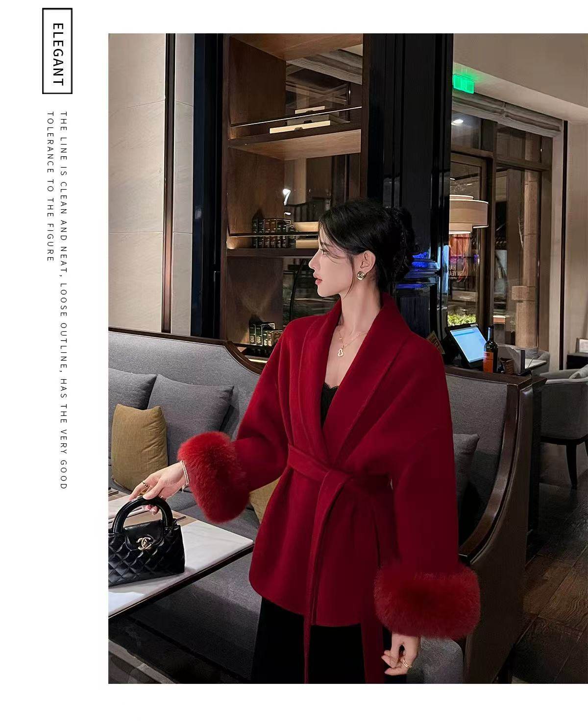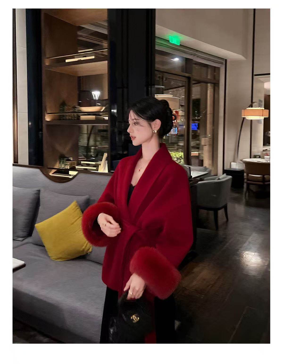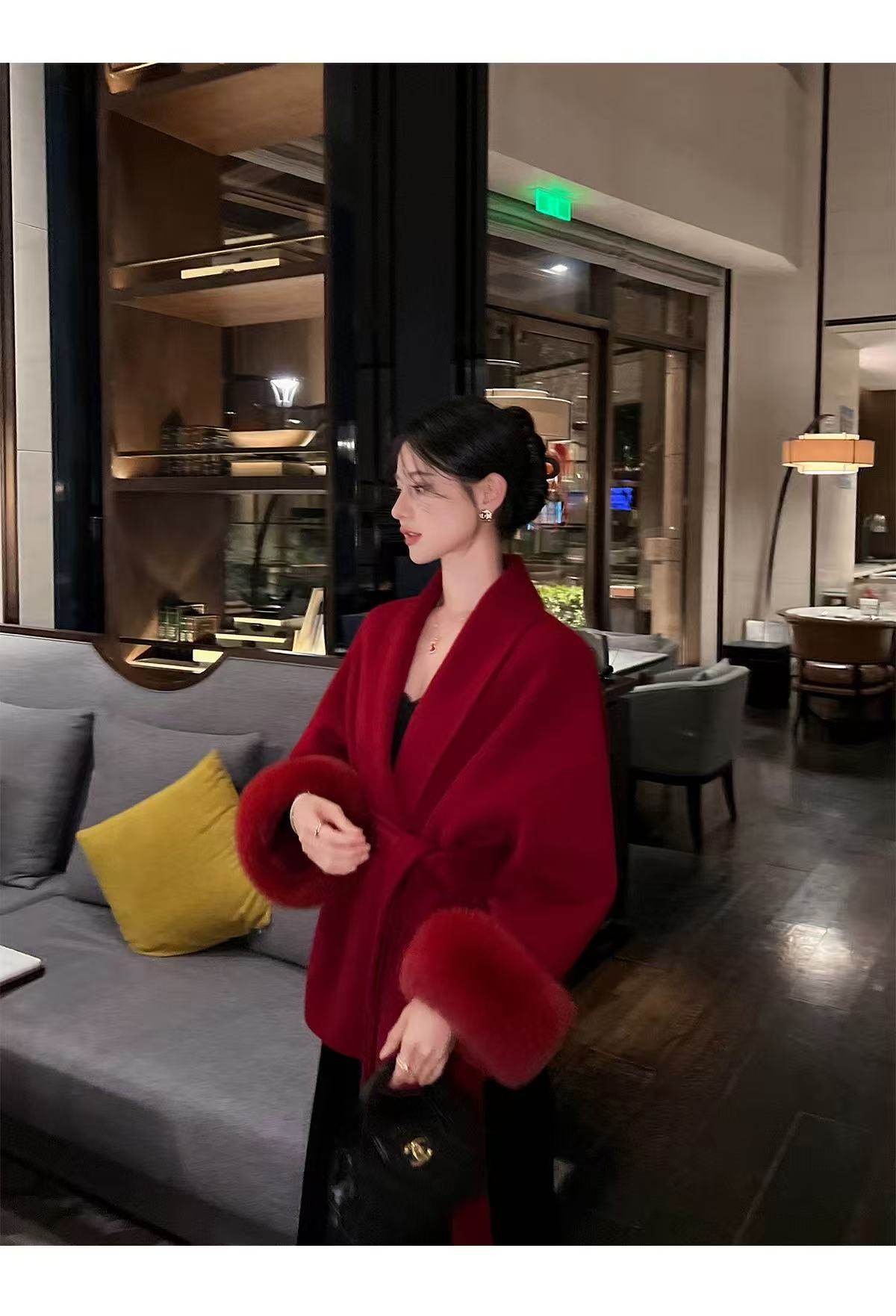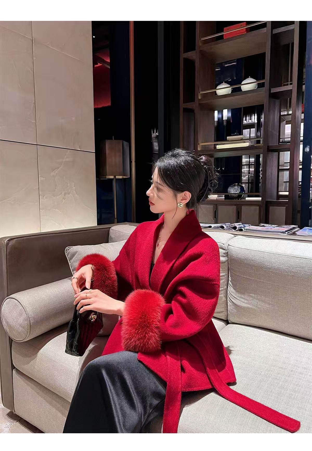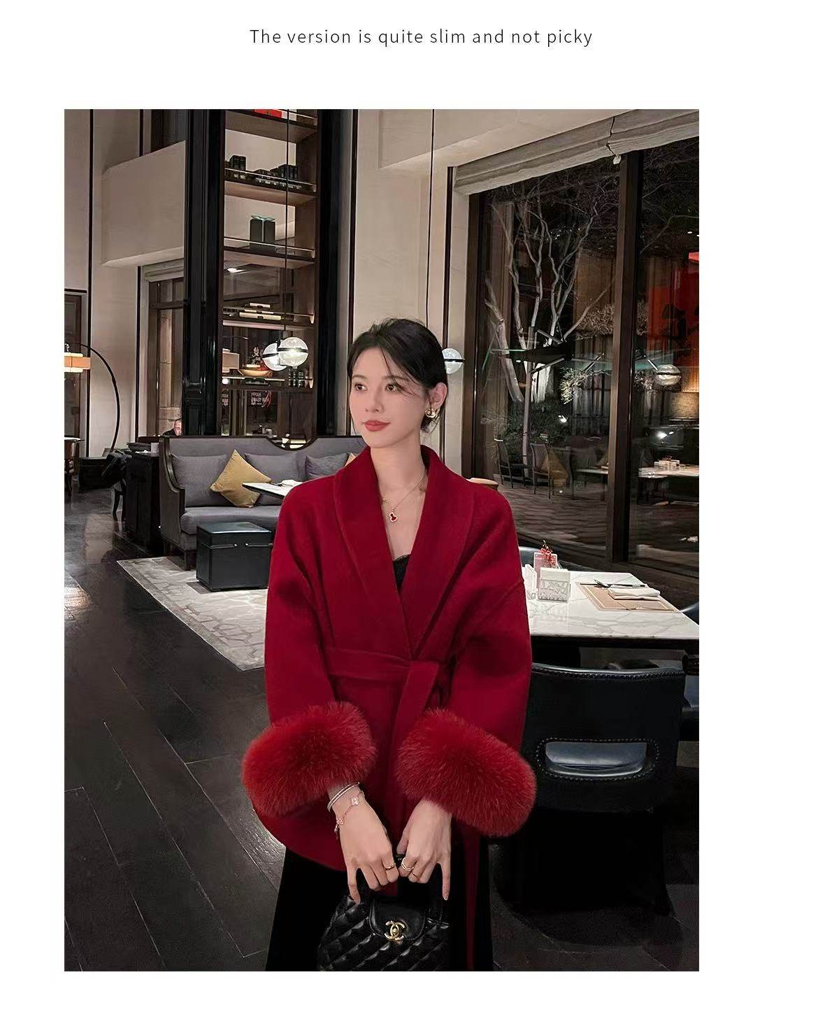 Women's red double-sided cashmere coat, new style for autumn and winter, with a noble lady temperament, fox fur cuffs, short coat for brides' wedding