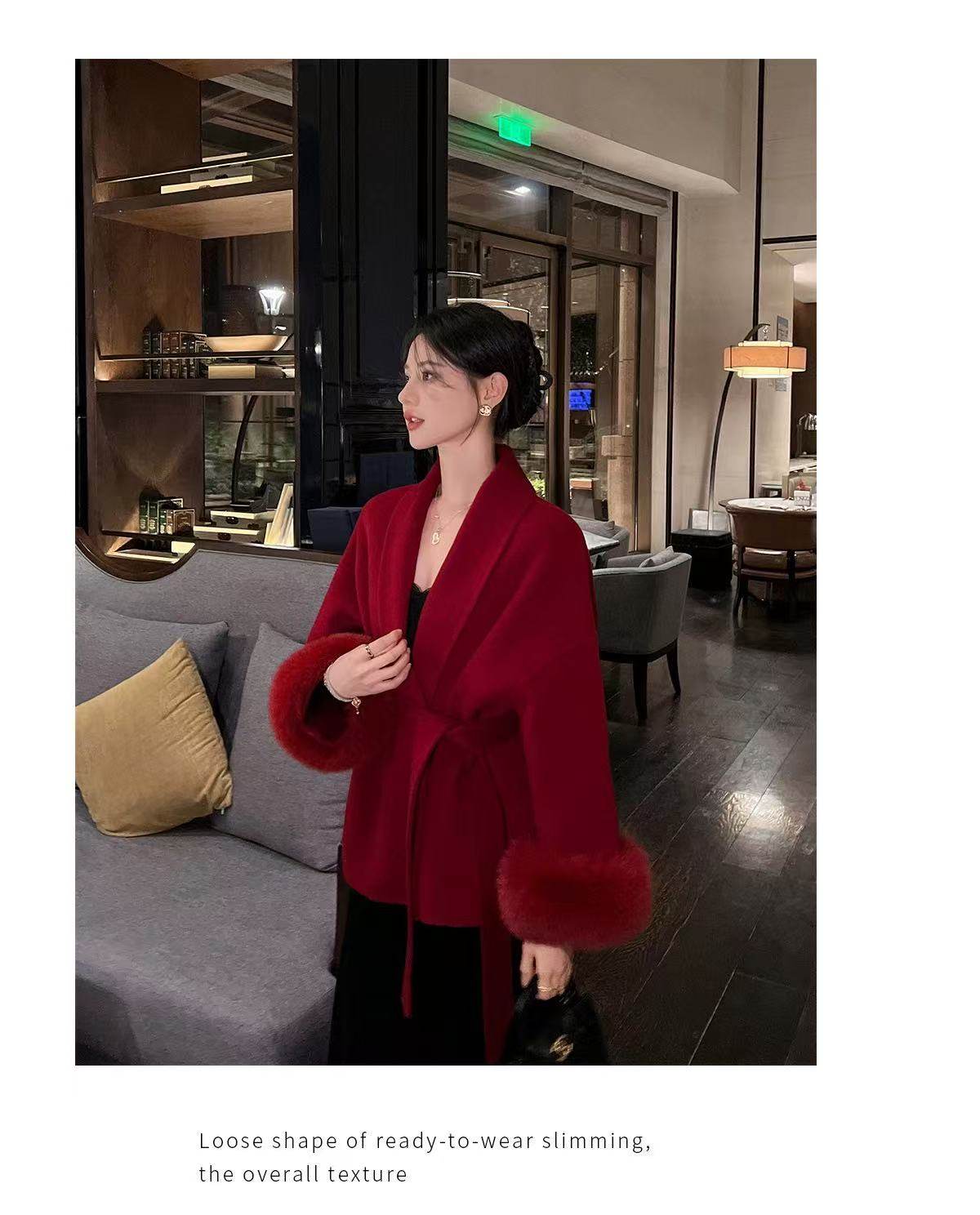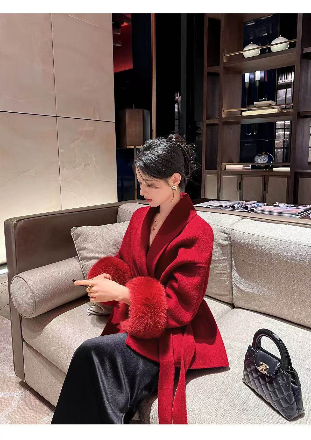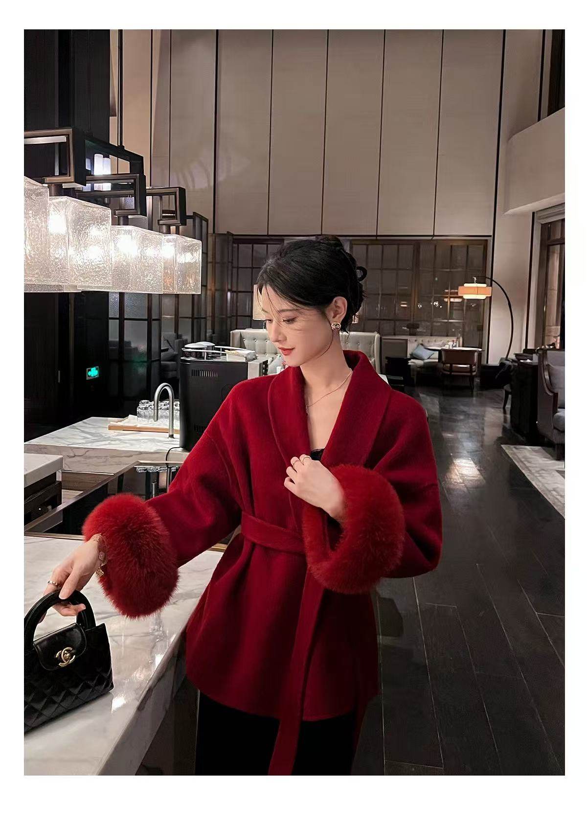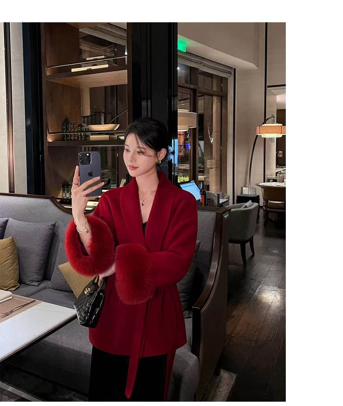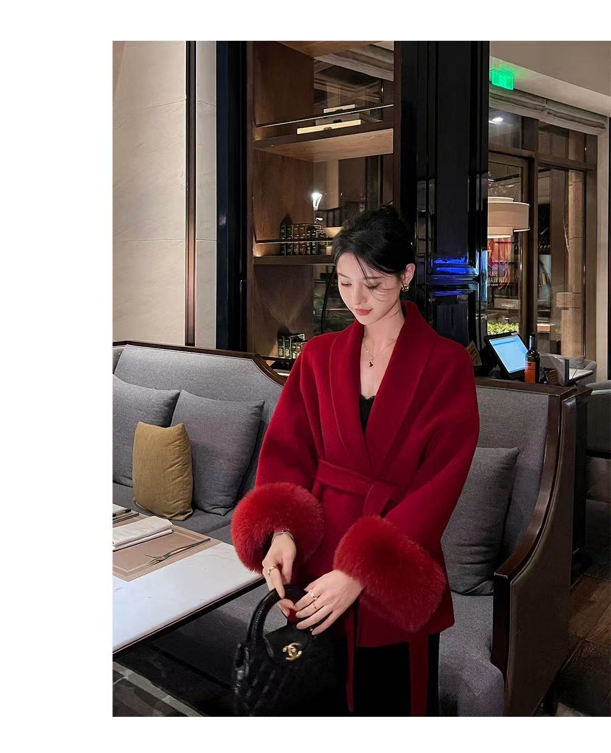 Women's red double-sided cashmere coat, new style for autumn and winter, with a noble lady temperament, fox fur cuffs, short coat for brides' wedding