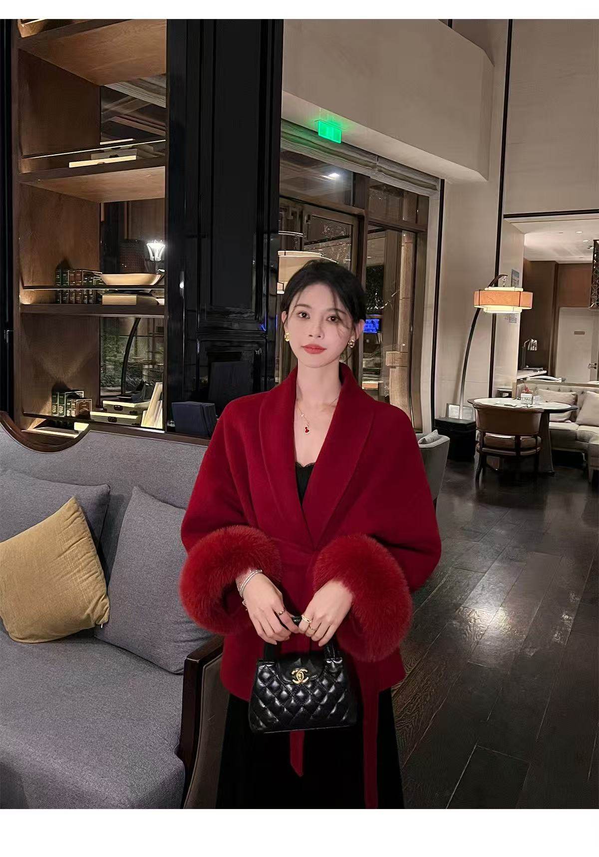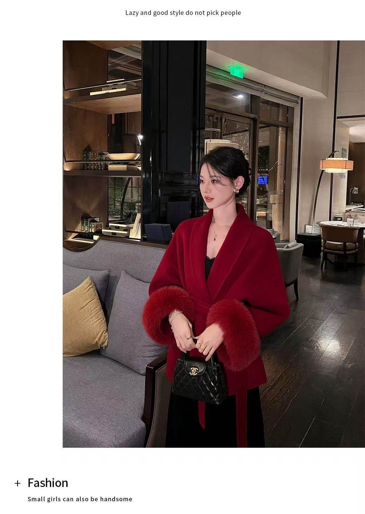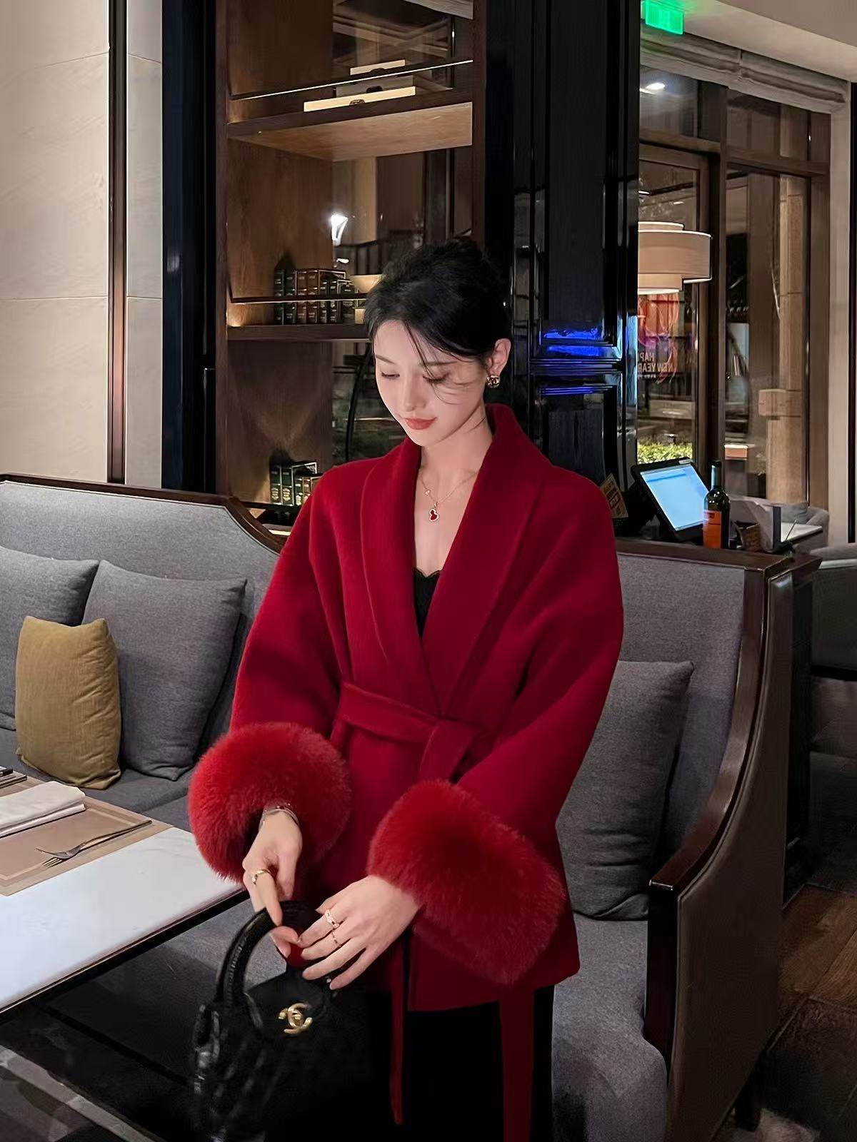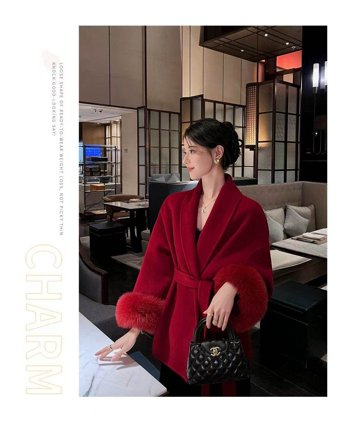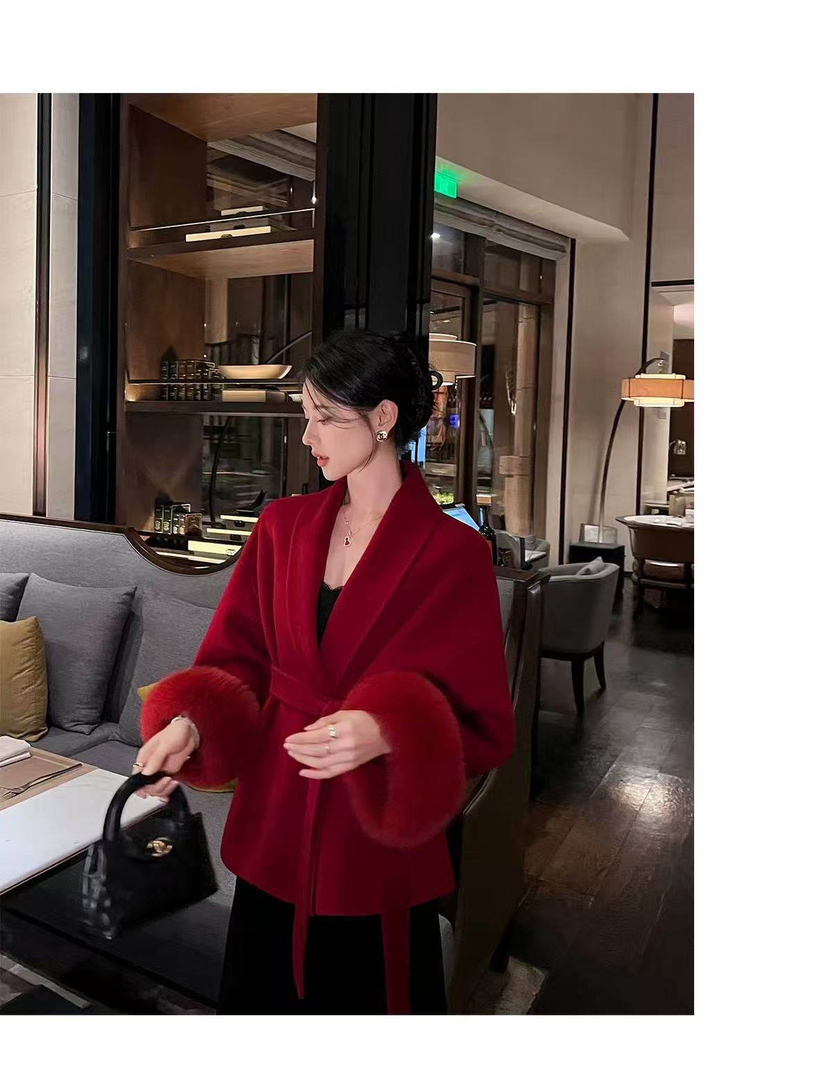 Women's red double-sided cashmere coat, new style for autumn and winter, with a noble lady temperament, fox fur cuffs, short coat for brides' wedding