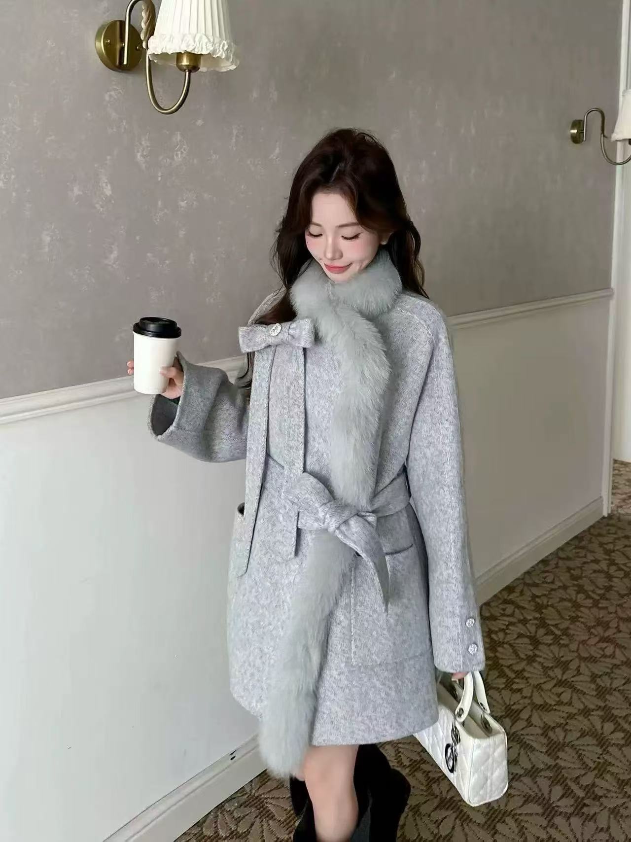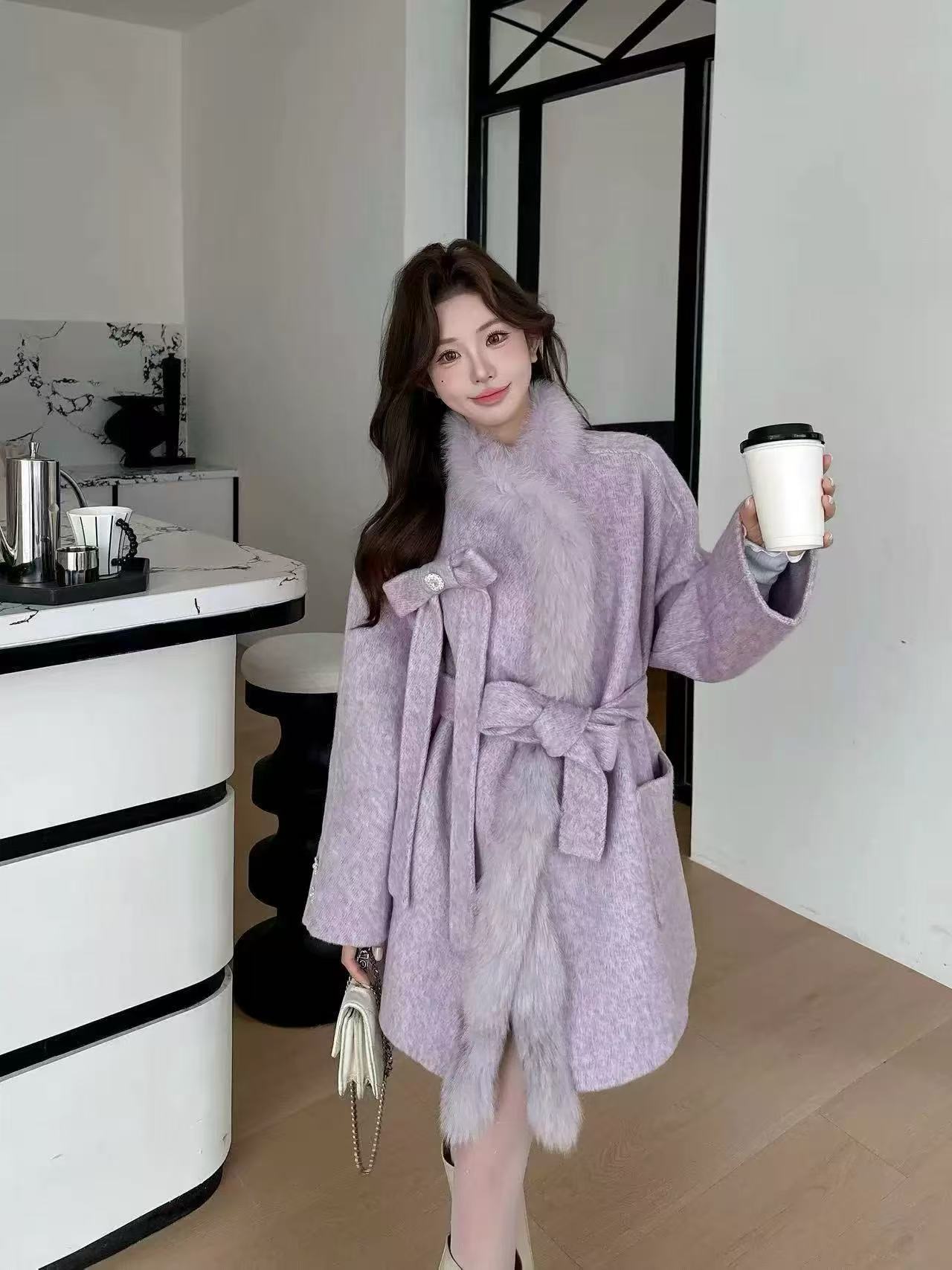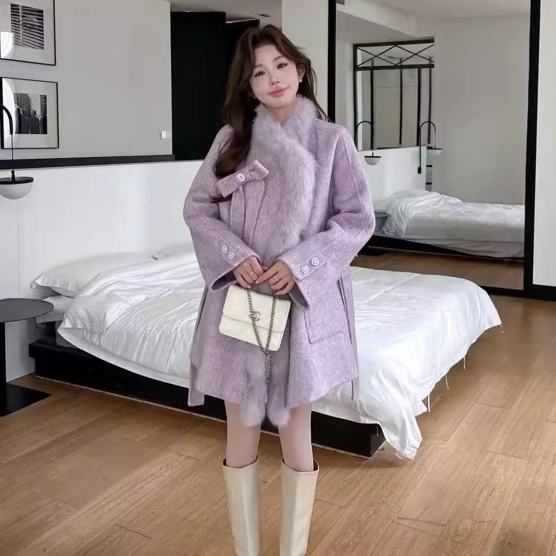 2025 Autumn & Winter New Women's Double-Sided Cashmere Coat with Purple Fox Fur Collar - Elegant Bow-Detailed Woolen Outerwear