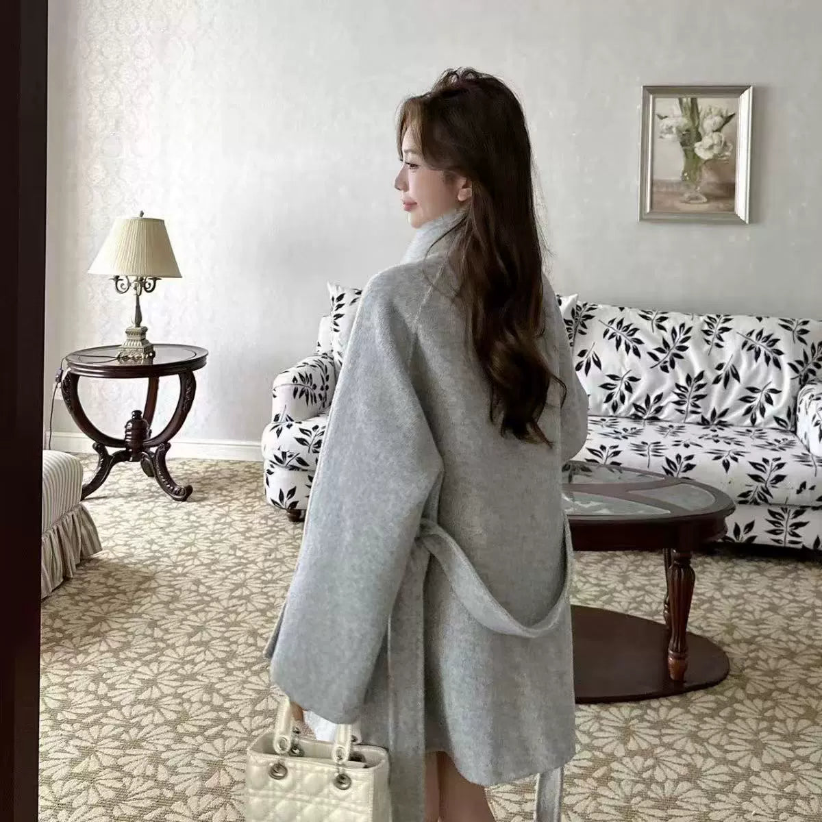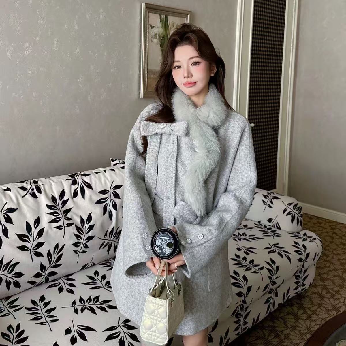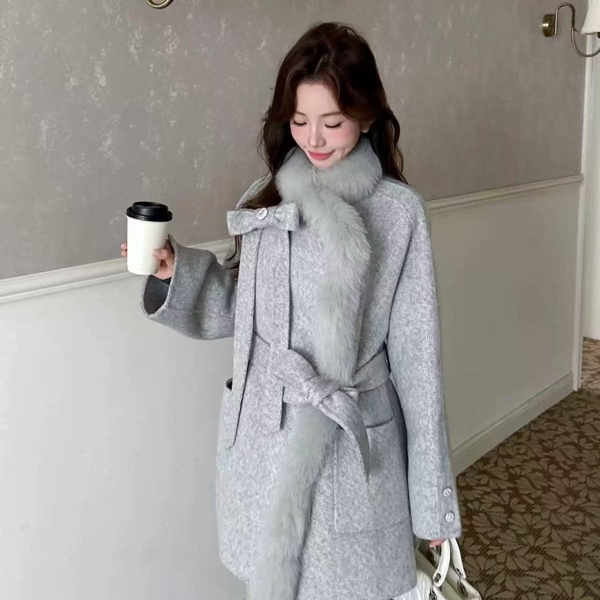 2025 Autumn & Winter New Women's Double-Sided Cashmere Coat with Purple Fox Fur Collar - Elegant Bow-Detailed Woolen Outerwear