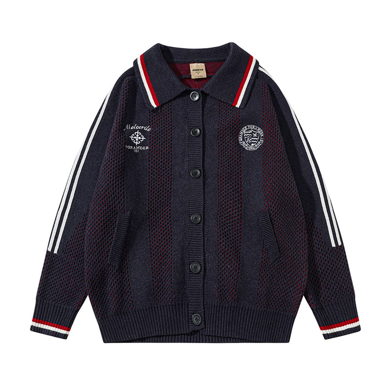 DESIGN FEATURES: Button-front cardigan with breathable mesh knit construction, ribbed trim, and sporty striped accents on collar and sleeves