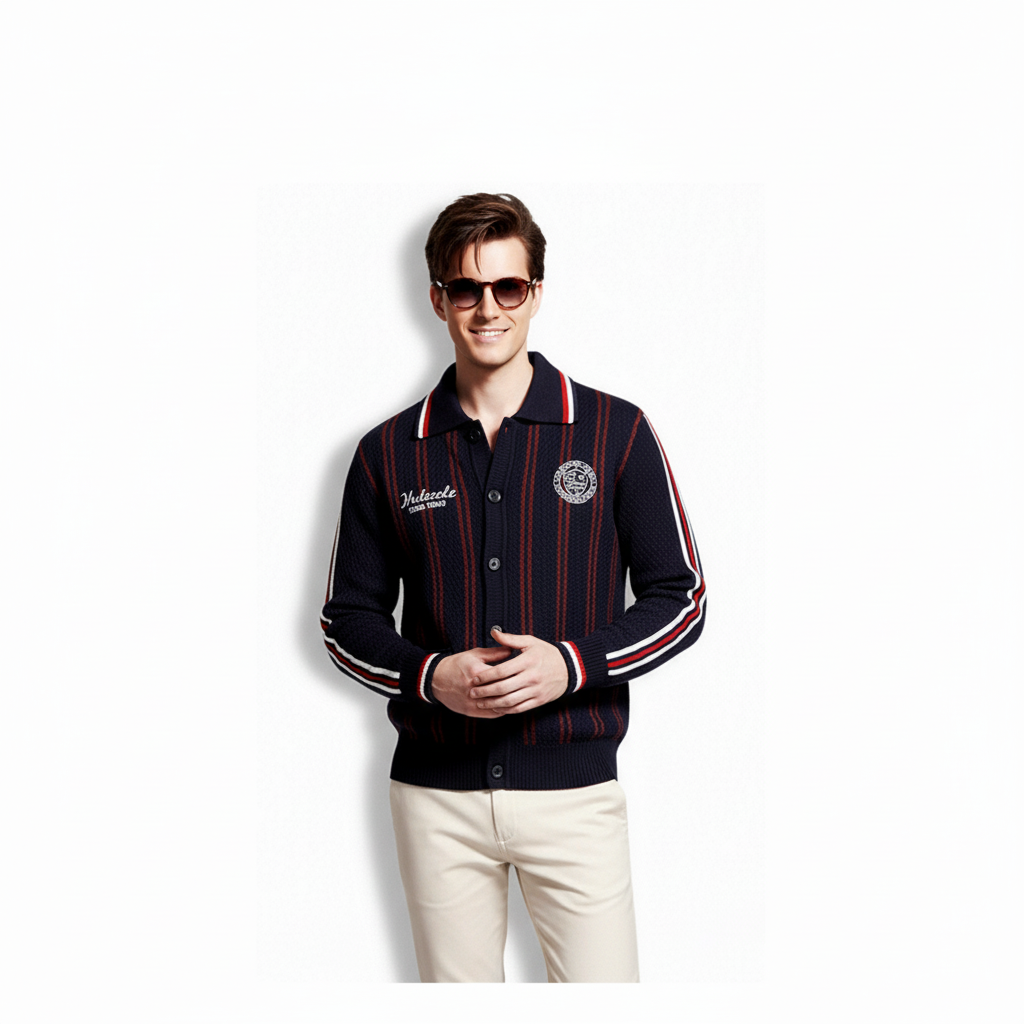 Fineryclothes Mesh Knit Button-Up Cardigan Sweater with Striped Trim, Polo Collar, White and Navy, 2-Pack