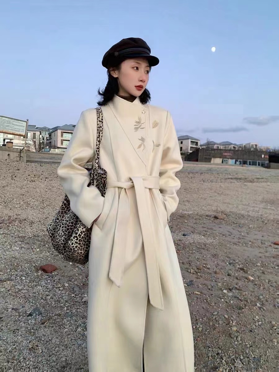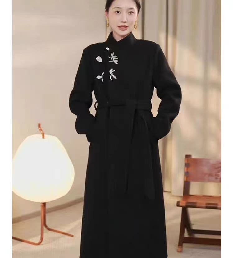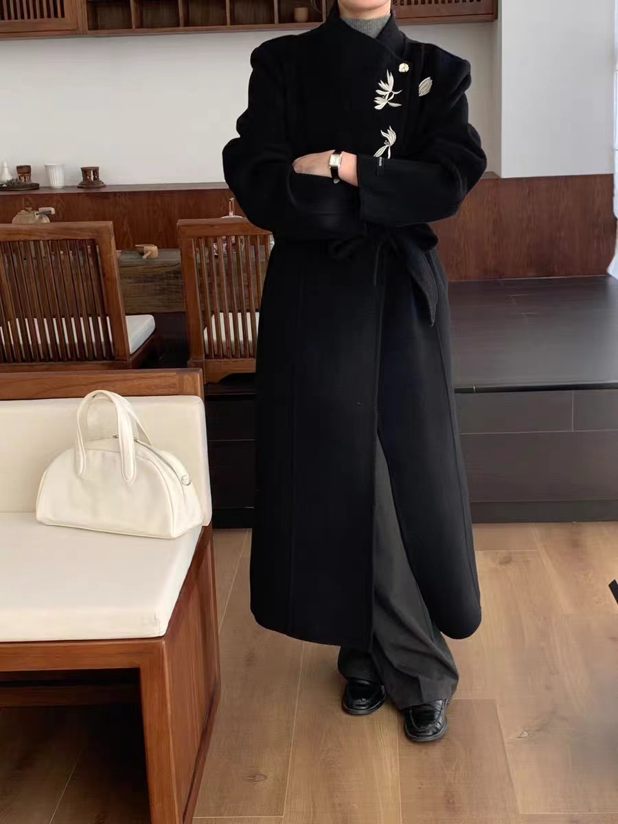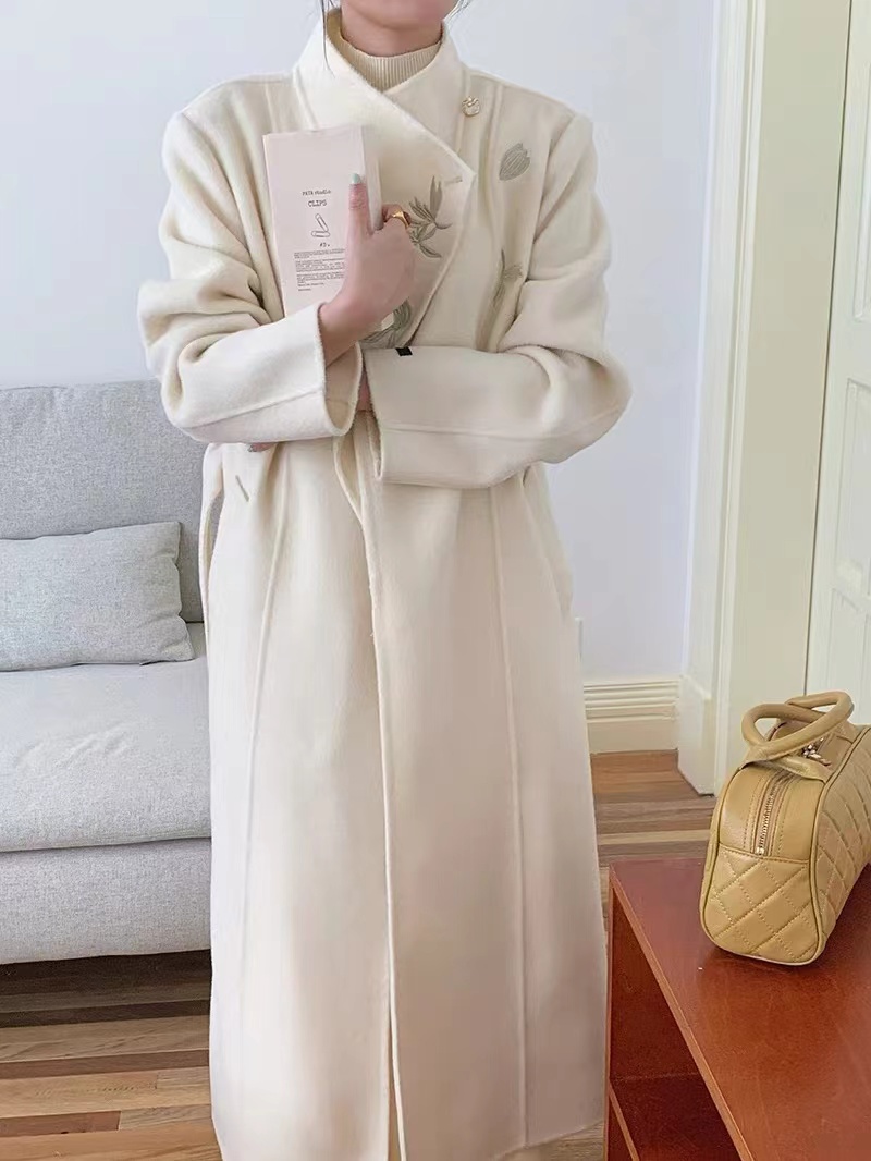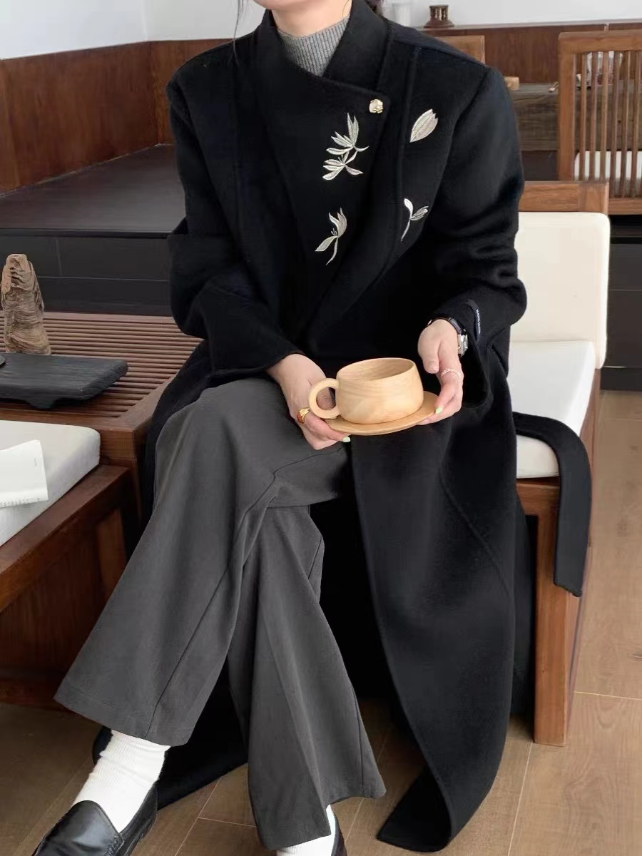 Women's 2025 A/W New Chinese Stand-up Collar Double-faced Cashmere Coat | Embroidered Long Woolen Outerwear